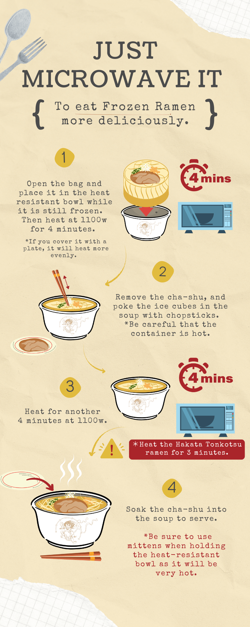 Instructional infographic on how to heat up frozen ramen in three steps: place in pot, cook on medium to high heat, and serve in a bowl.